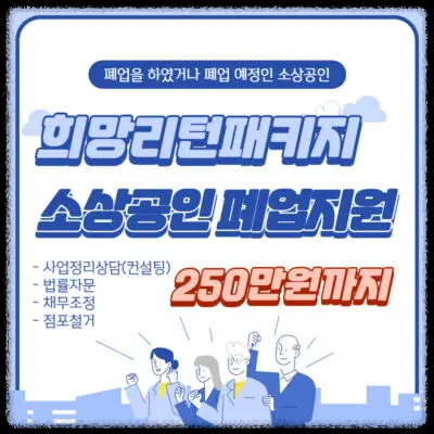 - 소상공인 분들을 대상으로 폐업 혹은 페업 예정인 소상공인을 대상으로 경영개선과 사업 정리 등을 지원하고 취업과 창업을 통한 재도전을 하나의 패키지로 지원하는 사업으로,